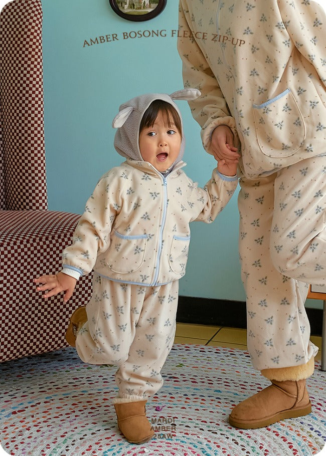 This fluffy fleece zip-up, perfect for fall and midwinter, is made of soft and warm polar fleece, and we developed a blueberry pattern for the fabric. This makes it a must-have item, exclusive to Amber!